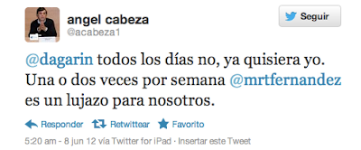 Pues al final mi subconsciente tenía razón y el pequeño texto que vimos ayer en Marca (edición impresa, os lo recuerdo) no va a ser el único. Durante la Eurocopa van a ser uno o dos textos semanales. Eso me confirmó ayer por twitter Angel Cabeza, de Marca, que confirmó que ojalá pudieran tenerla todos los días, pero que sólo será una o dos colaboraciones a la semana.